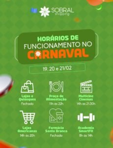 No carnaval de 2023, o Sobral Shoping apresenta horários diferenciados. Confira na imagem abaixo:
