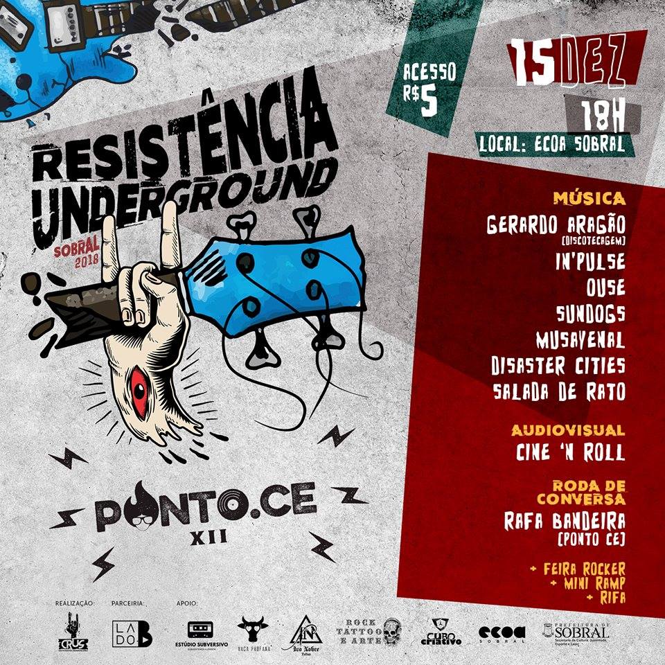 Em parceria com o Festival Ponto.CE o Resistência Underground Sobral 2018 acontece no próximo sábado, dia 15 de dezembro, a partir das 18h, no anfiteatro da ECOA, e o valor da entrada custa apenas R$ 5, ou seja, convida geral pra bater cabeça! 🤘🏿