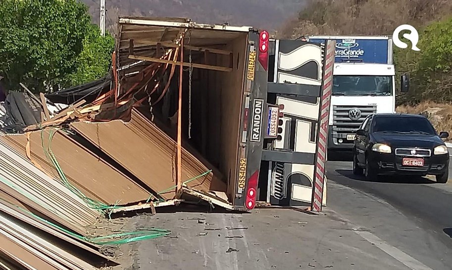 Nas imagens, é possível ver outros caminhões logo atrás do veículo tombado. Os outros motoristas conseguiram frear e evitar outro acidente.