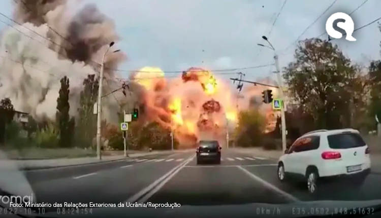 Uma câmera no painel de um veículo capturou o momento em que carros e pedestres evitaram por pouco uma explosão causada por um ataque russo em Dnipro, na Ucrânia, nesta segunda-feira (10).