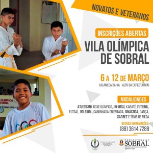 Alô, atletas de Sobral e região! A Vila Olímpica de Sobral abre as inscrições para alunos novatos e veteranos. As matrículas acontecem de 06 a 12 de março e devem feitas de forma PRESENCIAL na Vila Olímpica de Sobral (Alameda Bahia, S/N – Alto da Expectativa), de segunda a sexta-feira, das 7h às 11h e das 13h às 17h.